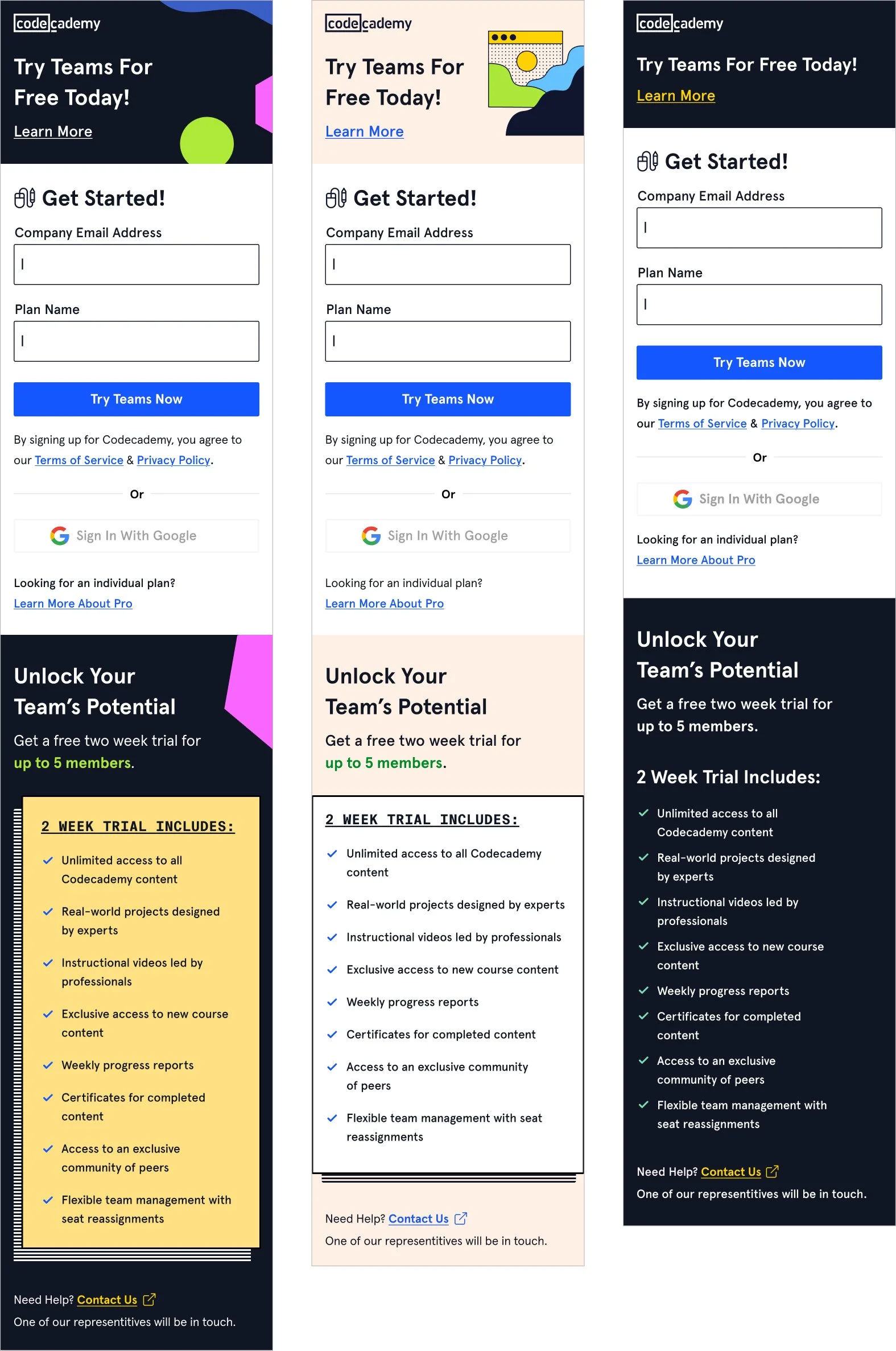Codecademy wanted to promote their business offerings for teams by creating more transparency around subscription products. We worked together to create an education-forward sign-up flow adaptable to all business customers which was able to be seamlessly integrated into their existing experience.